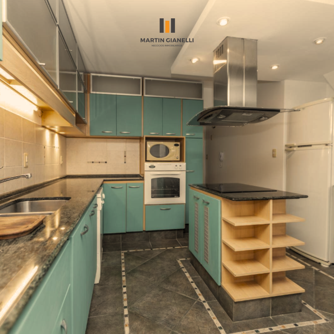 Cocina cómoda y moderna con 2 mesadas de granito y comedor diario. Se incluye heladera, anafe de vitrocerámica en una isla central con campana sobre la isla, horno eléctrico, microondas, lavavajillas y lava/secarropas (6/3kg).
