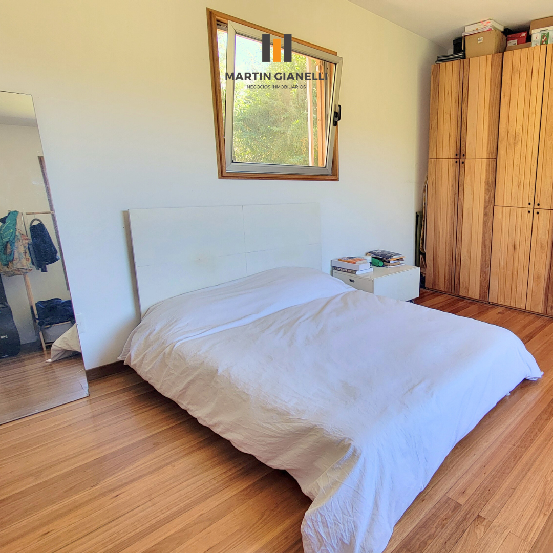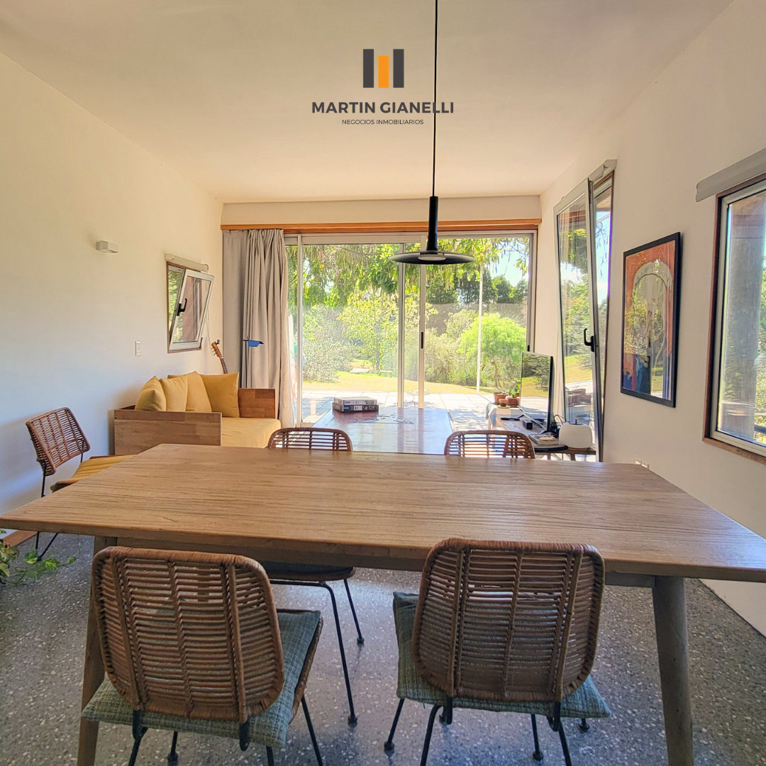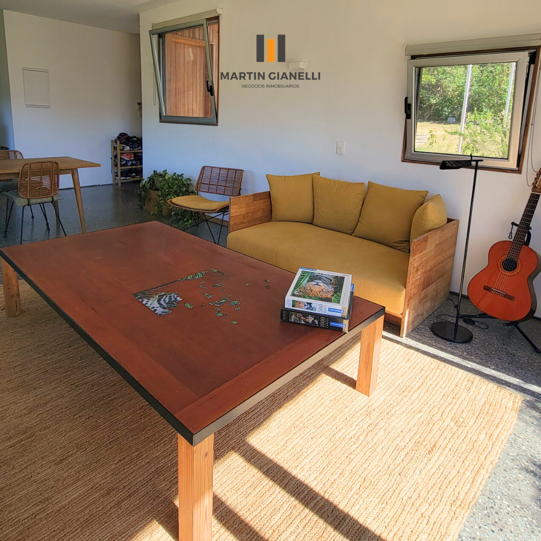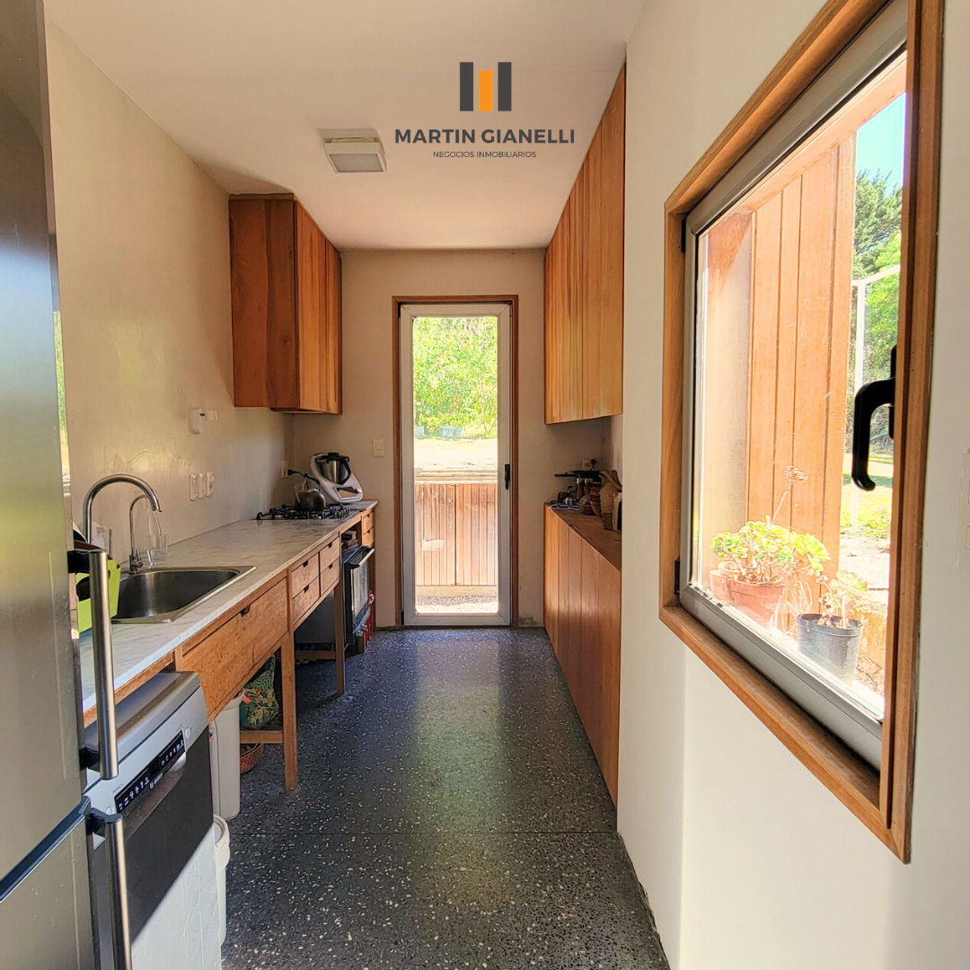 Dentro de la casa nos encontramos con un gran living comedor, integrado a la cocina, muy luminoso, ventilado, con una estufa mayólica de alto rendimiento y hermosos pisos de monolítico in situ. Adentrándonos, nos encontramos un escritorio o espacio de estar, que hoy oficia de dormitorio abierto, pero de fácil modificación si se necesitara cerrar. En el dormitorio principal nos encontramos con un generoso ambiente bien luminoso y con pisos de madera Eucaliptus Grandis de exportación. con aberturas que nos dan un panorama total hacia el frente y el fondo. La cocina, con sus muebles en madera, nos dan una gran calidez, además de su gran capacidad de guardado. Desde la misma se accede a otra entrada de servicio con salida al espacio que hoy oficia de lavadero. El baño es espacioso, ventilado y con luz natural.