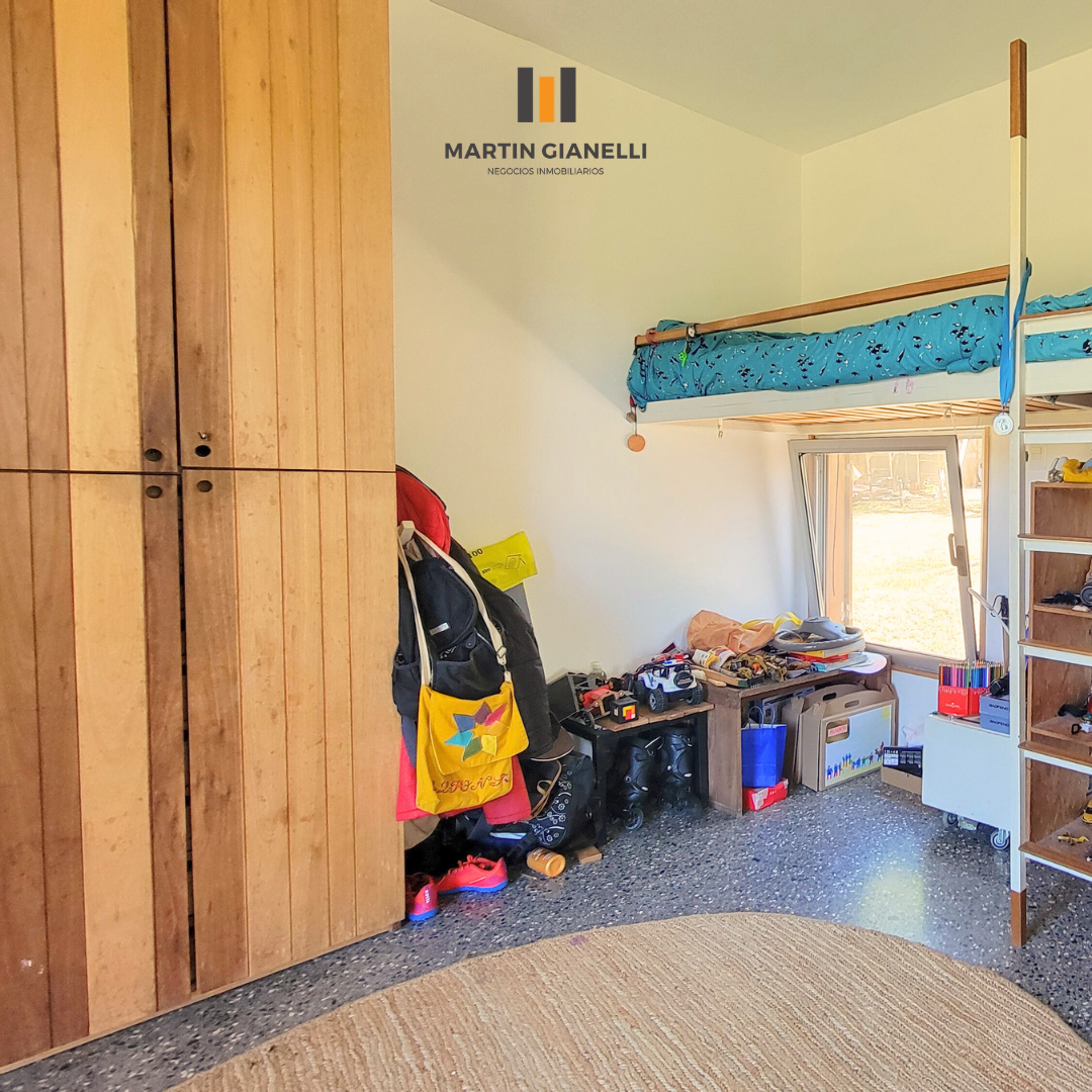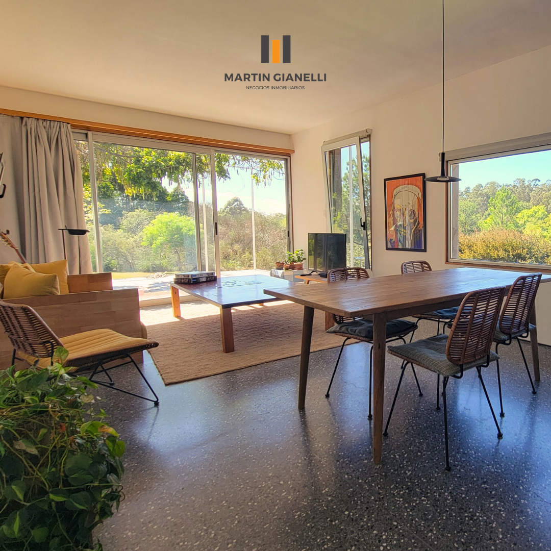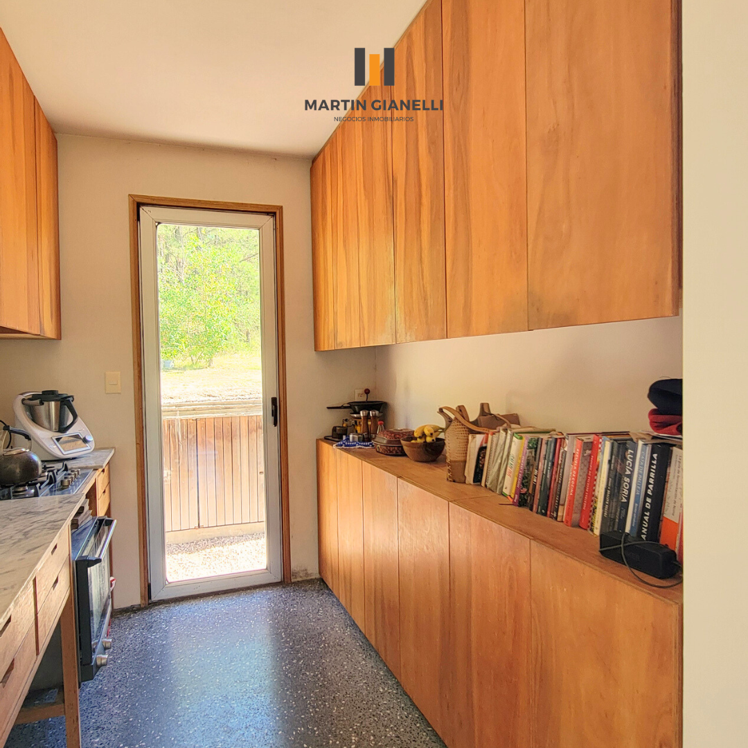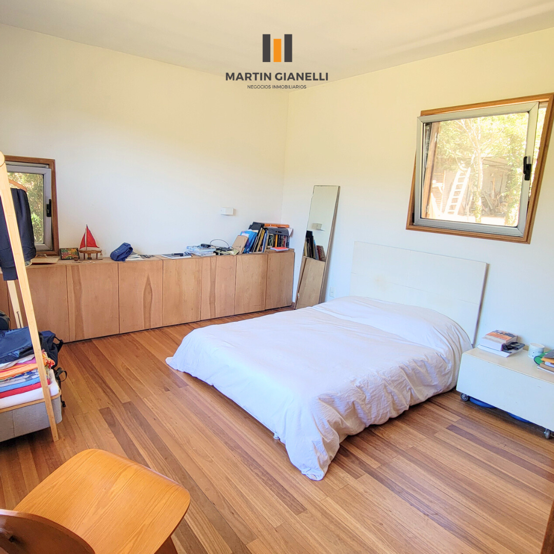 Dentro de la casa nos encontramos con un gran living comedor, integrado a la cocina, muy luminoso, ventilado, con una estufa mayólica de alto rendimiento y hermosos pisos de monolítico in situ. Adentrándonos, nos encontramos un escritorio o espacio de estar, que hoy oficia de dormitorio abierto, pero de fácil modificación si se necesitara cerrar. En el dormitorio principal nos encontramos con un generoso ambiente bien luminoso y con pisos de madera Eucaliptus Grandis de exportación. con aberturas que nos dan un panorama total hacia el frente y el fondo. La cocina, con sus muebles en madera, nos dan una gran calidez, además de su gran capacidad de guardado. Desde la misma se accede a otra entrada de servicio con salida al espacio que hoy oficia de lavadero. El baño es espacioso, ventilado y con luz natural.