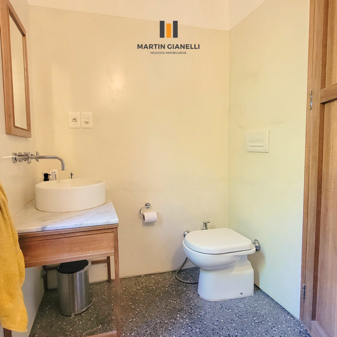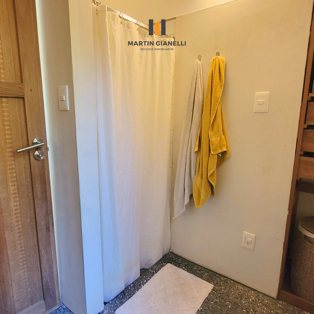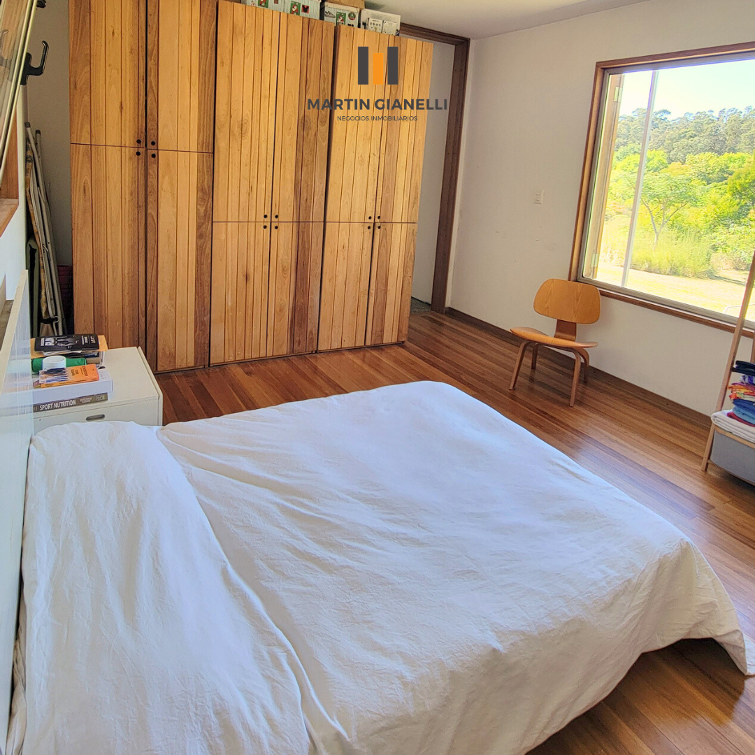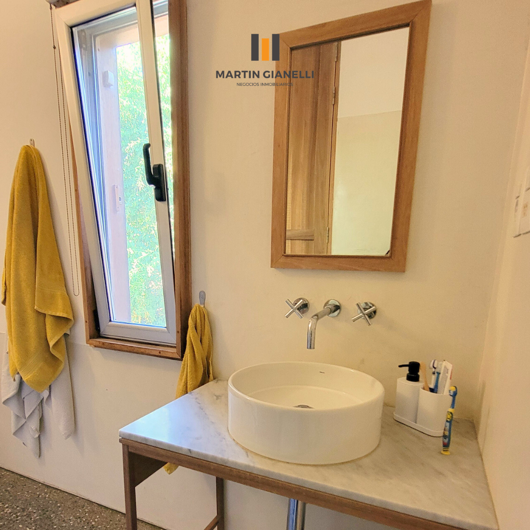 Dentro de la casa nos encontramos con un gran living comedor, integrado a la cocina, muy luminoso, ventilado, con una estufa mayólica de alto rendimiento y hermosos pisos de monolítico in situ. Adentrándonos, nos encontramos un escritorio o espacio de estar, que hoy oficia de dormitorio abierto, pero de fácil modificación si se necesitara cerrar. En el dormitorio principal nos encontramos con un generoso ambiente bien luminoso y con pisos de madera Eucaliptus Grandis de exportación. con aberturas que nos dan un panorama total hacia el frente y el fondo. La cocina, con sus muebles en madera, nos dan una gran calidez, además de su gran capacidad de guardado. Desde la misma se accede a otra entrada de servicio con salida al espacio que hoy oficia de lavadero. El baño es espacioso, ventilado y con luz natural.
