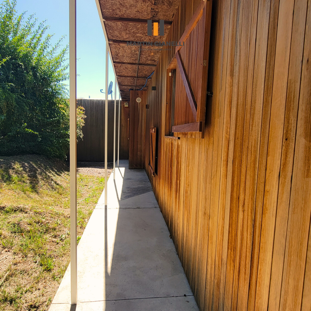 Toda la casa posee múltiples lugares de guardado tanto en dormitorios, cocina y baño. Volviendo al exterior nos encontramos con una gran área de césped, verde y despejada, pero también con sus áreas arboladas que incluso nos conectan con un arroyo.