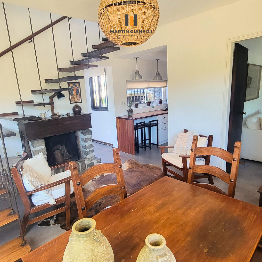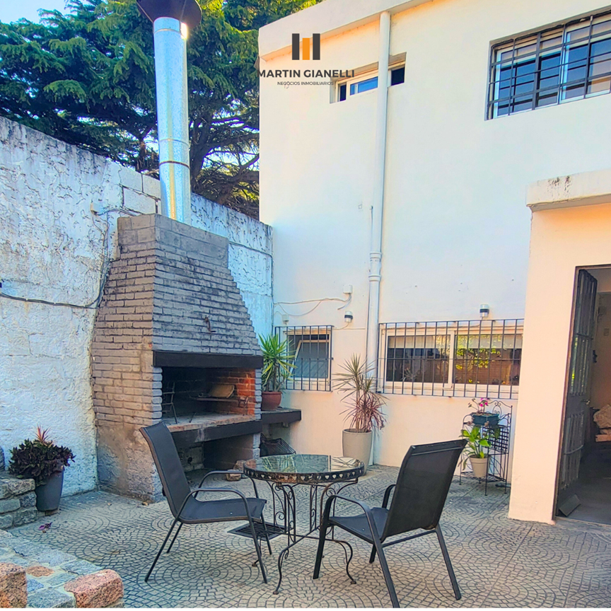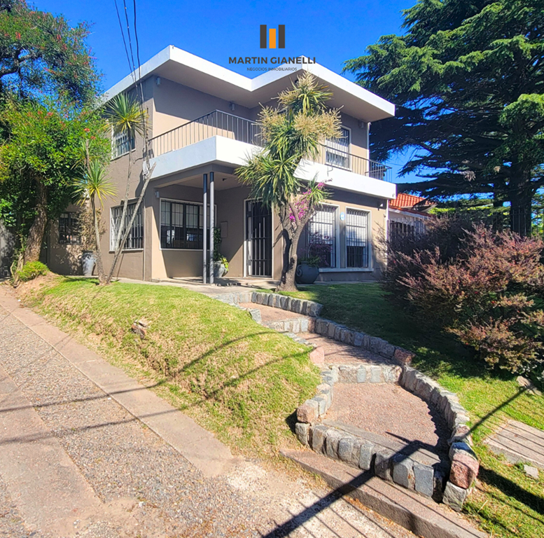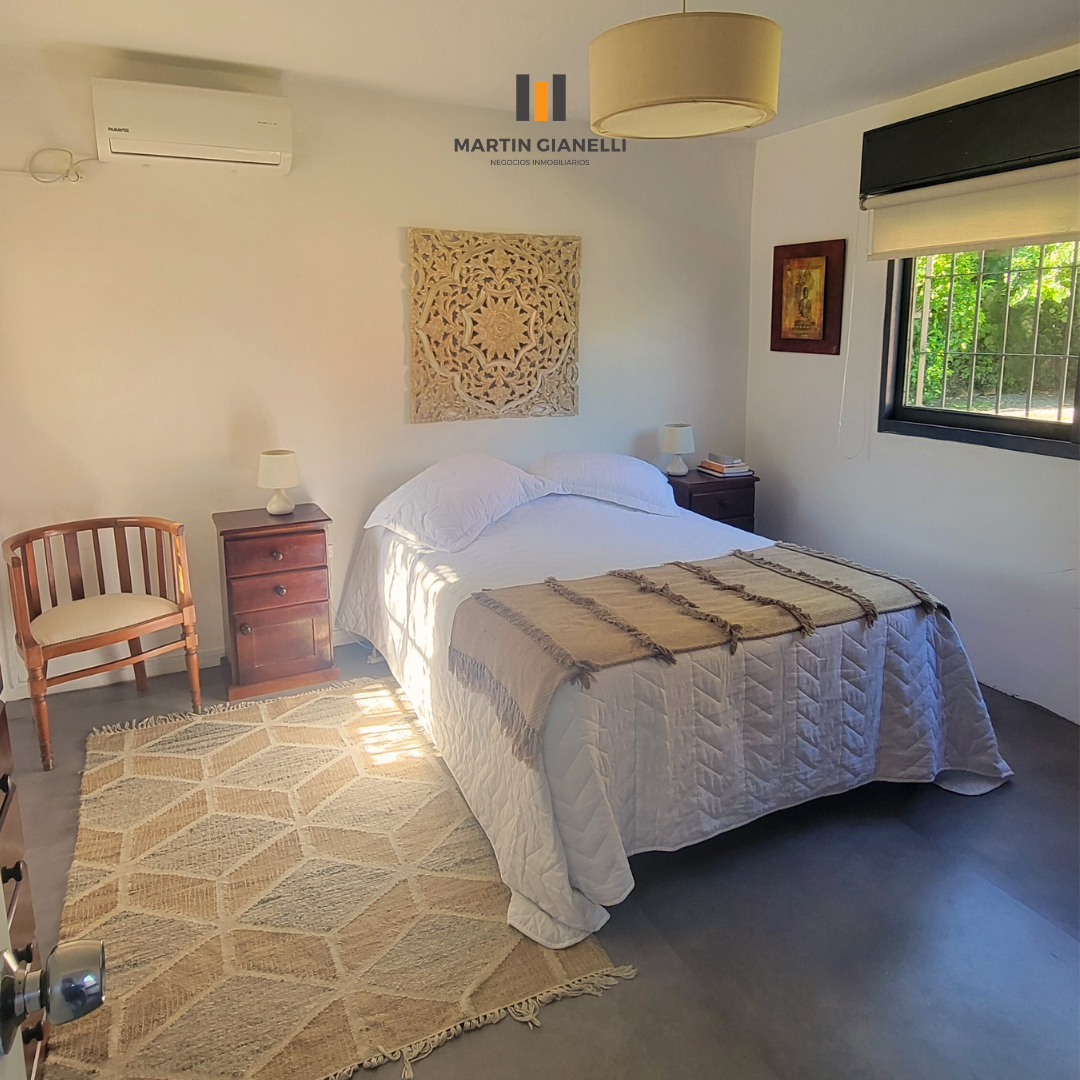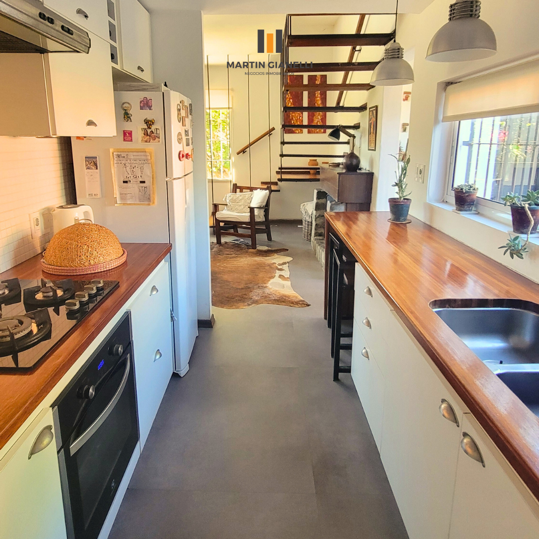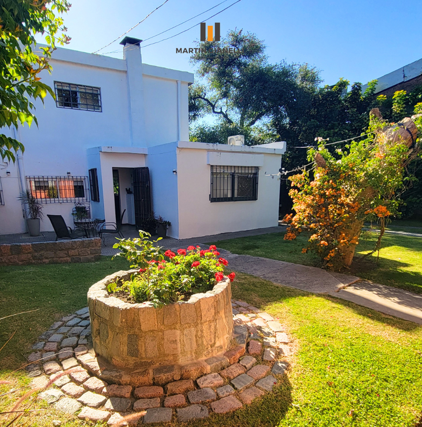 La casa principal, al frente, consta de dos plantas. En la planta baja encontramos un hermoso living con ventanales al frente que le aportan una gran luminosidad, un estar comedor con estufa a leña, con ventanas al norte y oeste, dándole luz natural todo el día. Cocina semi integrada, moderna, con muebles aéreos y bajo mesada, horno empotrado, anafe empotrada y una amplia mesada de granito y pileta doble de acero inoxidable bajo el ventanal apaisado que da hacia el fondo y el parrillero. Dormitorio de gran tamaño con ventanas este-oeste y con aire acondicionado. En planta baja también contamos con un baño completo reciclado y moderno.