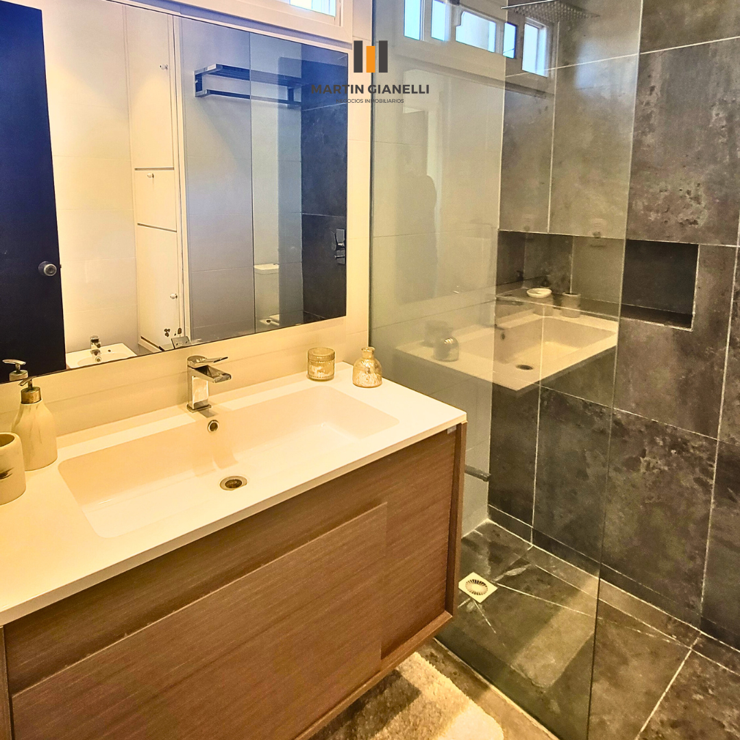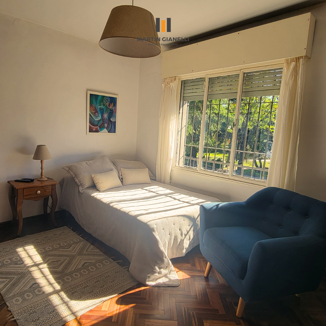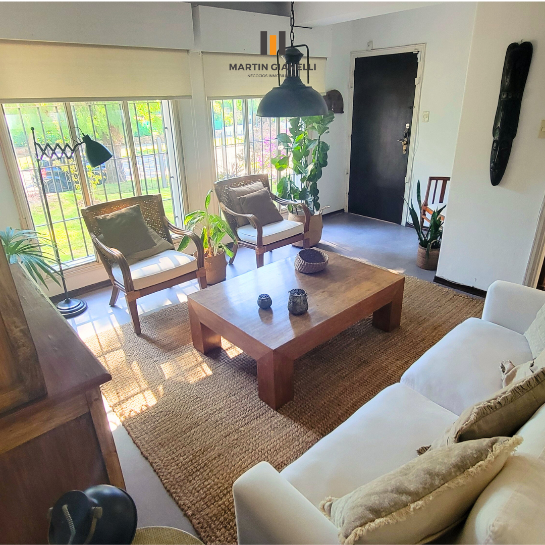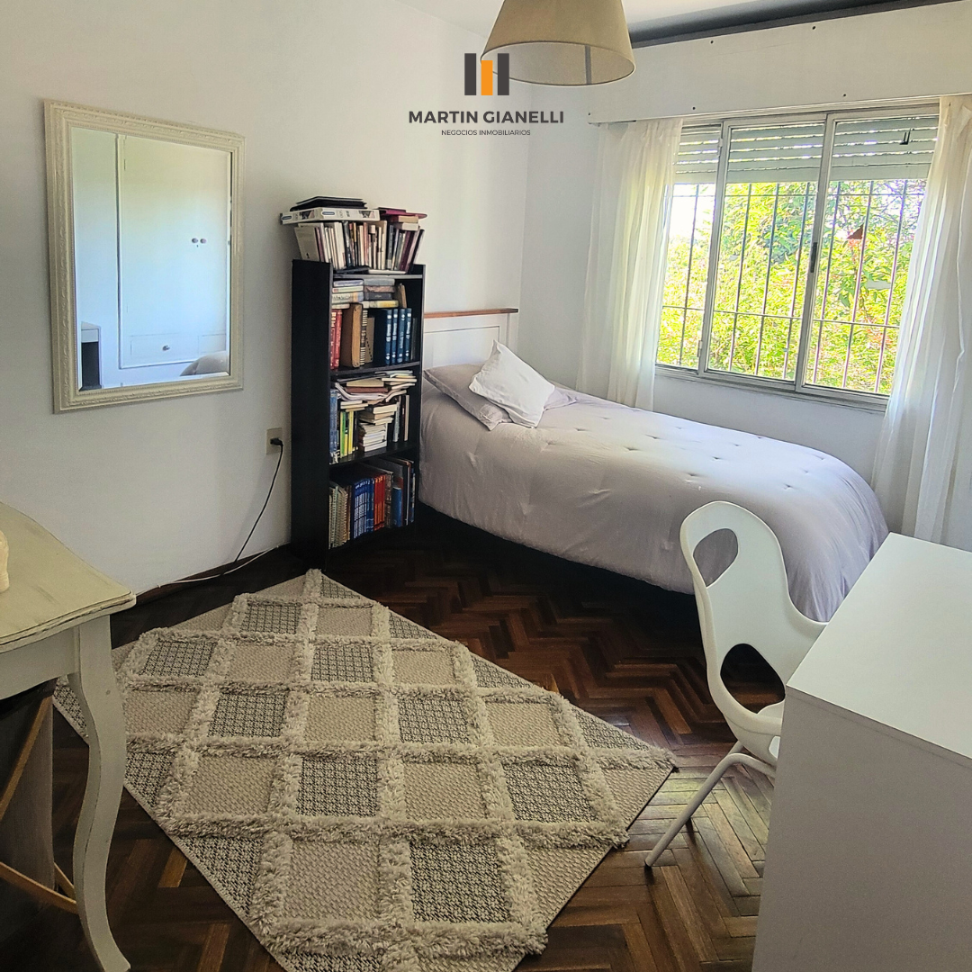La casa principal, al frente, consta de dos plantas. En la planta baja encontramos un hermoso living con ventanales al frente que le aportan una gran luminosidad, un estar comedor con estufa a leña, con ventanas al norte y oeste, dándole luz natural todo el día. Cocina semi integrada, moderna, con muebles aéreos y bajo mesada, horno empotrado, anafe empotrada y una amplia mesada de granito y pileta doble de acero inoxidable bajo el ventanal apaisado que da hacia el fondo y el parrillero. Dormitorio de gran tamaño con ventanas este-oeste y con aire acondicionado. En planta baja también contamos con un baño completo reciclado y moderno.